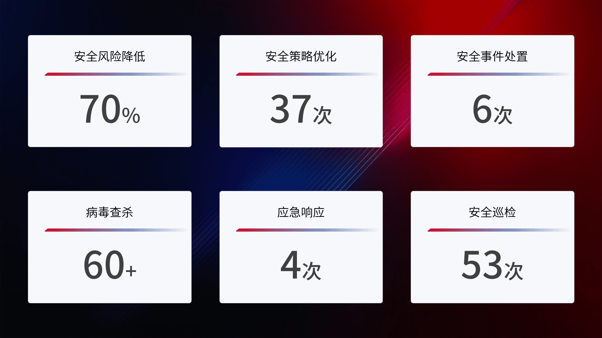 提供全面的安全事件报告体系,,包括处置报告、、、、周报、、、季度和年度总结,,,,结合持续监控,,,帮助客户深入了解网络安全状况。。。。