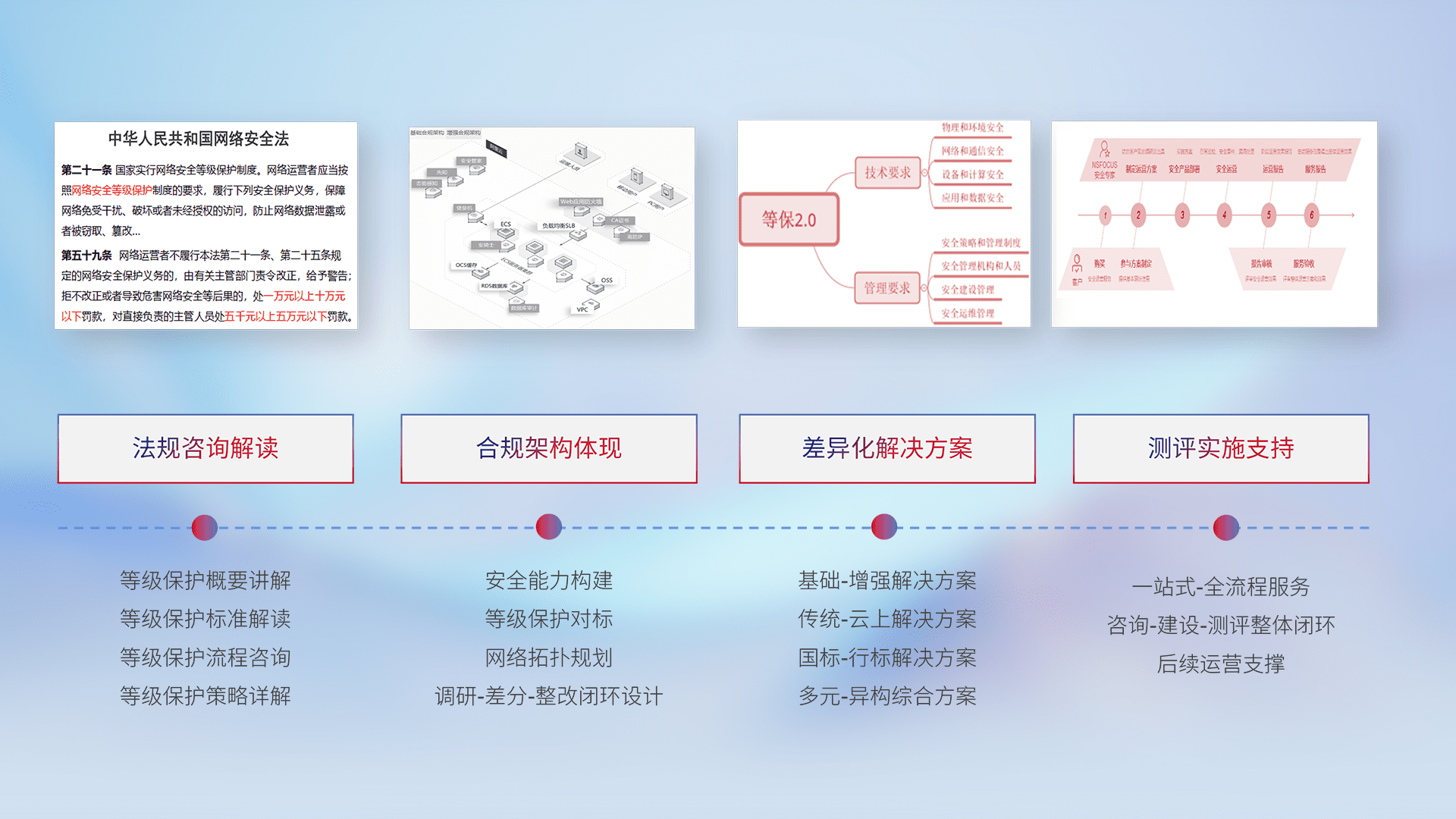 通过专业的法律咨询解读、、、合规架构体现、、差异化解决方案、、、测试实施支持等服务,,为客户量身打造等保合规体系。。。